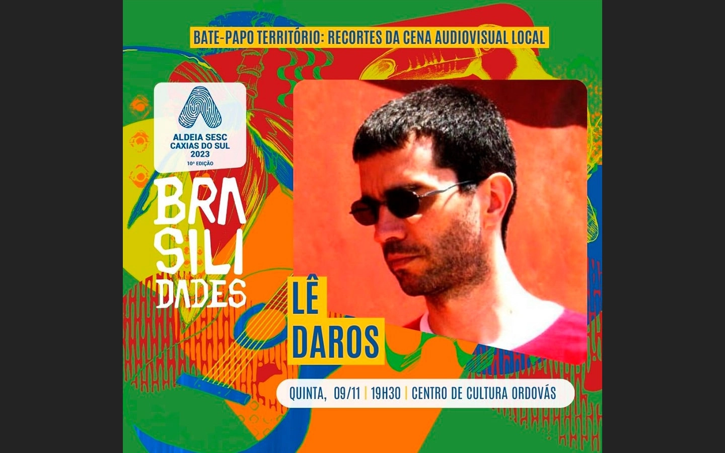 Sob o tema “Brasilidades” uma longa e rica programação ocupou vários espaços de Caxias. E uma das atividades foi o bate-papo “Território: Recortes da Cena Audiovisual Local” que aconteceu no Centro de Cultura Ordovás, no dia 09/11/23, às 20:00, com Daros e mais quatro realizadores de Caxias (Lissandro Stallivieri, Robinson Cabral, Daniel Vargas e Jorge de Jesus), além de Anderson Mueller como mediador.
