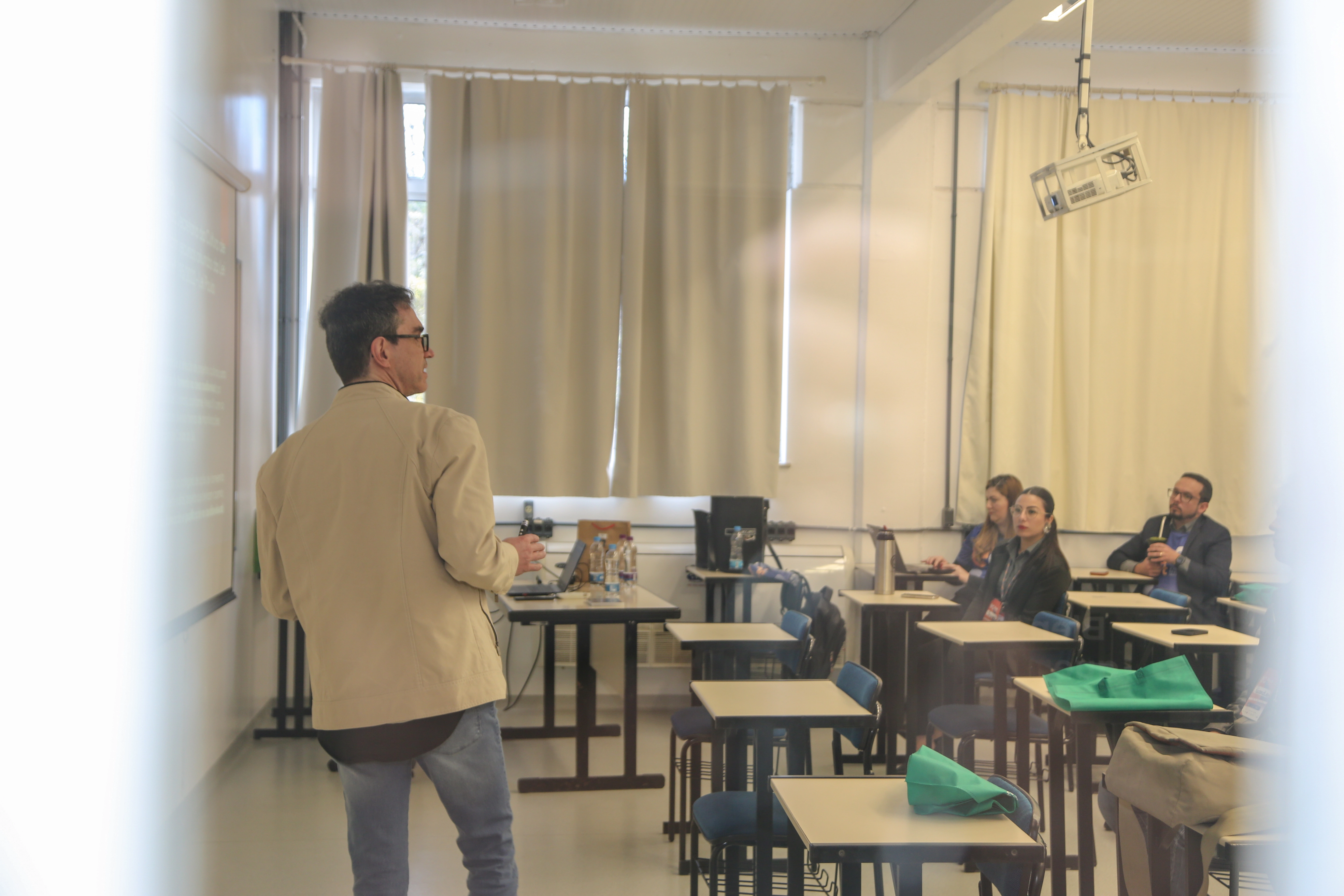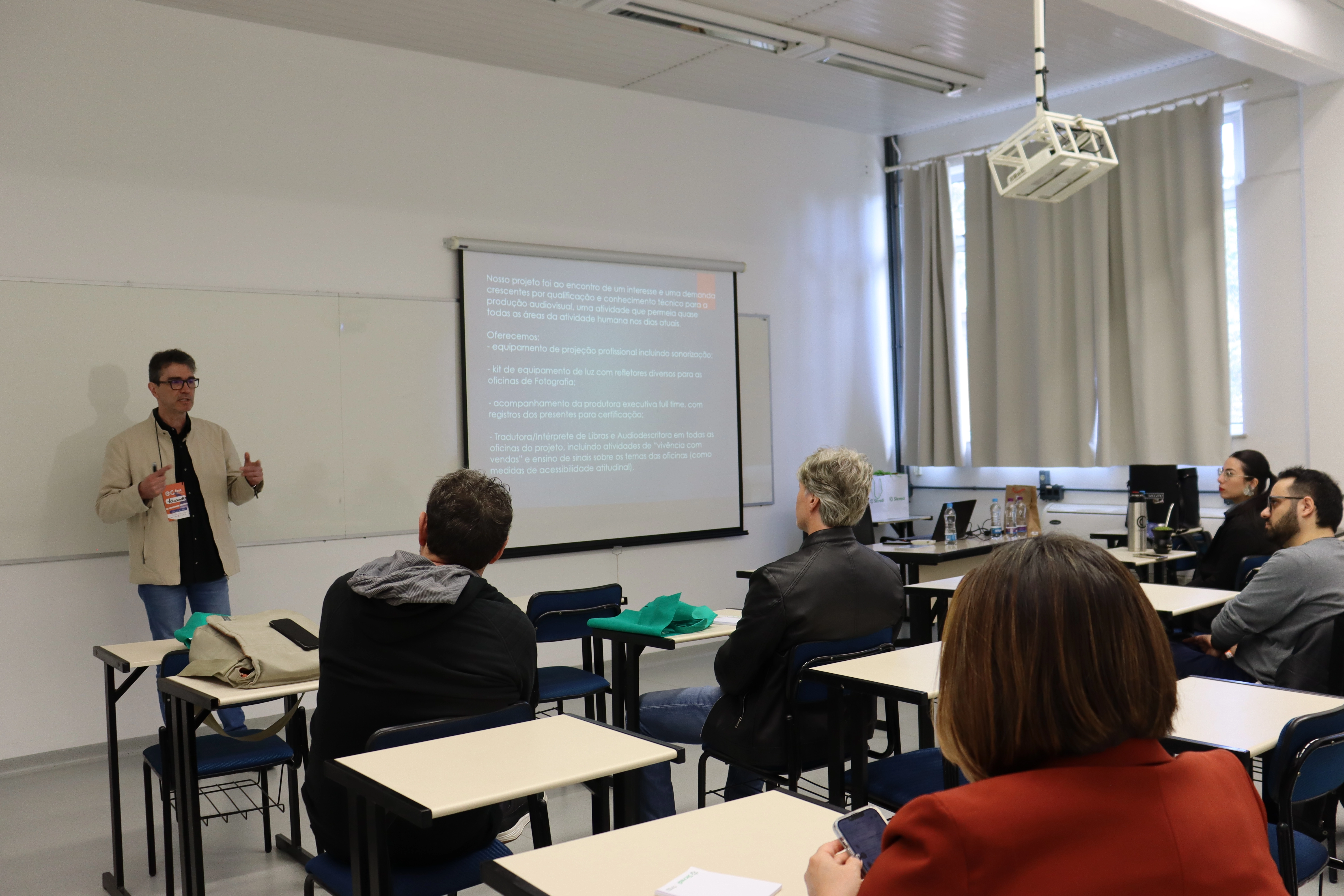 No dia 29 de agosto passado ocorreu a 8a edição do E.C. Fest, Festival da Economia Criativa. O evento, que é realizado pela Microempa, ocorreu no Bloco J da Universidade de Caxias do Sul. Seu objetivo é promover um dia inteiro de palestras, painéis e atividades lúdicas visando apresentar à comunidade "cases" ligados à criatividade e também oportunizar oportunidades de negócios. E desta vez, Daros foi convidado para falar sobre o projeto Oficinas Especializadas de Audiovisual, realizado em junho passado, descrevendo o processo de ensino, o engajamento dos participantes e os primeiros resultados de seus aprendizados em roteiro e fotografia para vídeos; projeto que buscou levar conhecimento técnico da área do audiovisual para públicos normalmente sem acesso à esses conteúdos. Na palestra, além de apresentar dados estatísticos, registros fotográficos e percepções sobre os resultados, Daros também fez uma breve apresentação sobre os conteúdos desenvolvidos. E com a presença de um bom público, ao final houve um animado bate-papo, oportunizando a fala a todos os presentes.